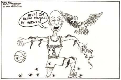 This cartoon was done during increasing tensions within' the NCAA about student athletes relationships with agents.